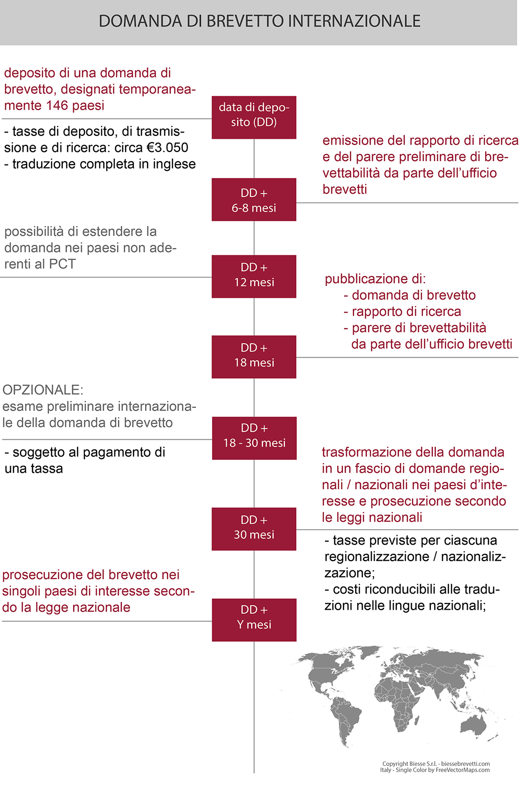 I professionisti dello studio Biesse hanno maturato una lunga esperienza sulle prosecuzioni delle domande di brevetto nel mondo. Nel caso più semplice la procedura internazionale si sviluppa secondo il seguente schema: Procedura PCT (semplificata)